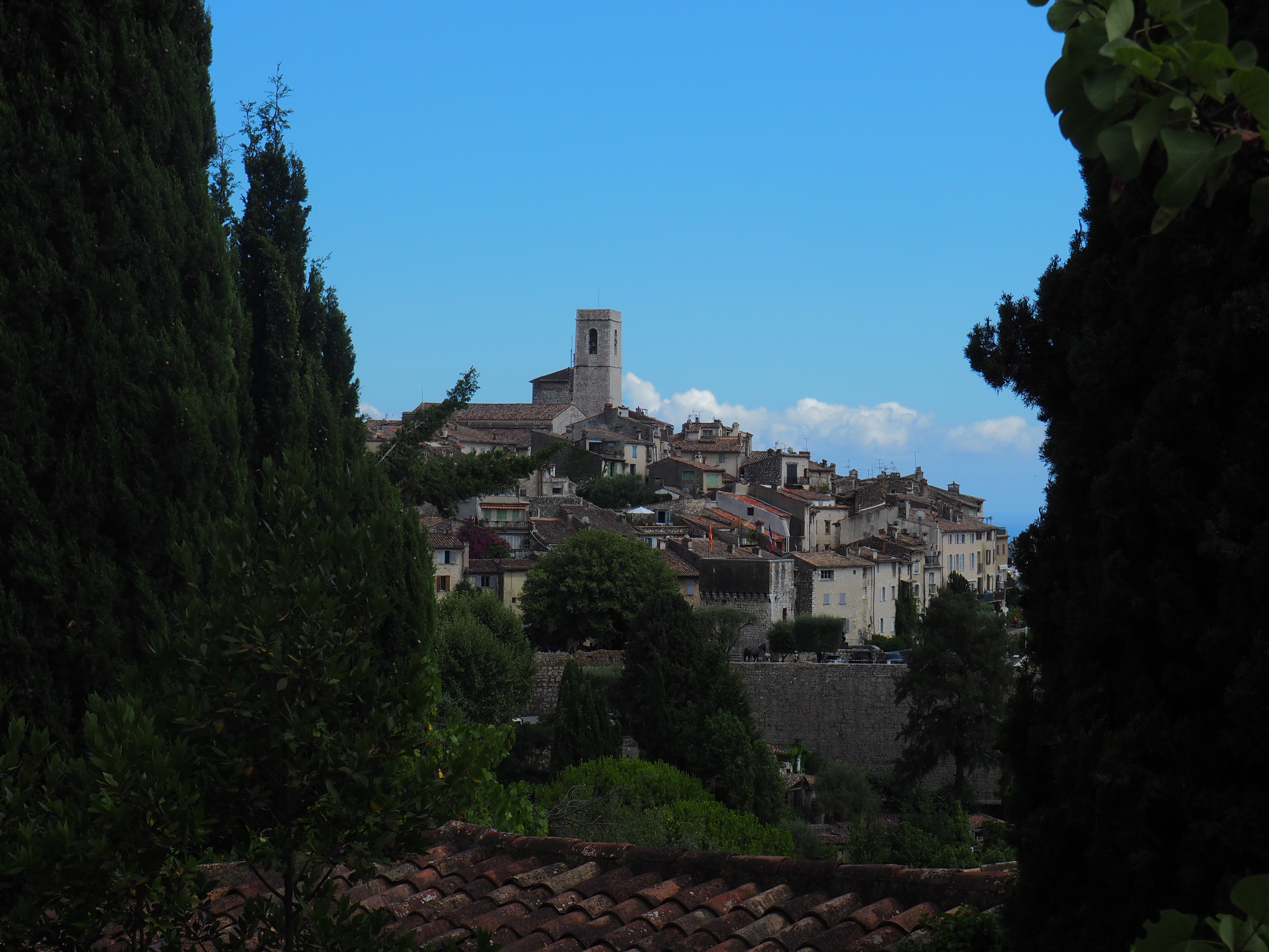 Vence. Vence had been recommended to us by a couple of friends, so on our second full day, we headed up the coast to Antibes and then inland to drive up the hills and into this cool hilltop town. We’d booked a table at Côté Jardin – Chez Anne whose terrasse overlooks the valley and fresh lemon from their terrace-neighboring trees are used in many dishes, desserts and boissons. Our hostess knew we were coming, probably due to the surprisingly low-key nature of Sunday afternoon reservation inventory and my clearly non-native French. The meal was trés deliceux and the atmosphere genial.