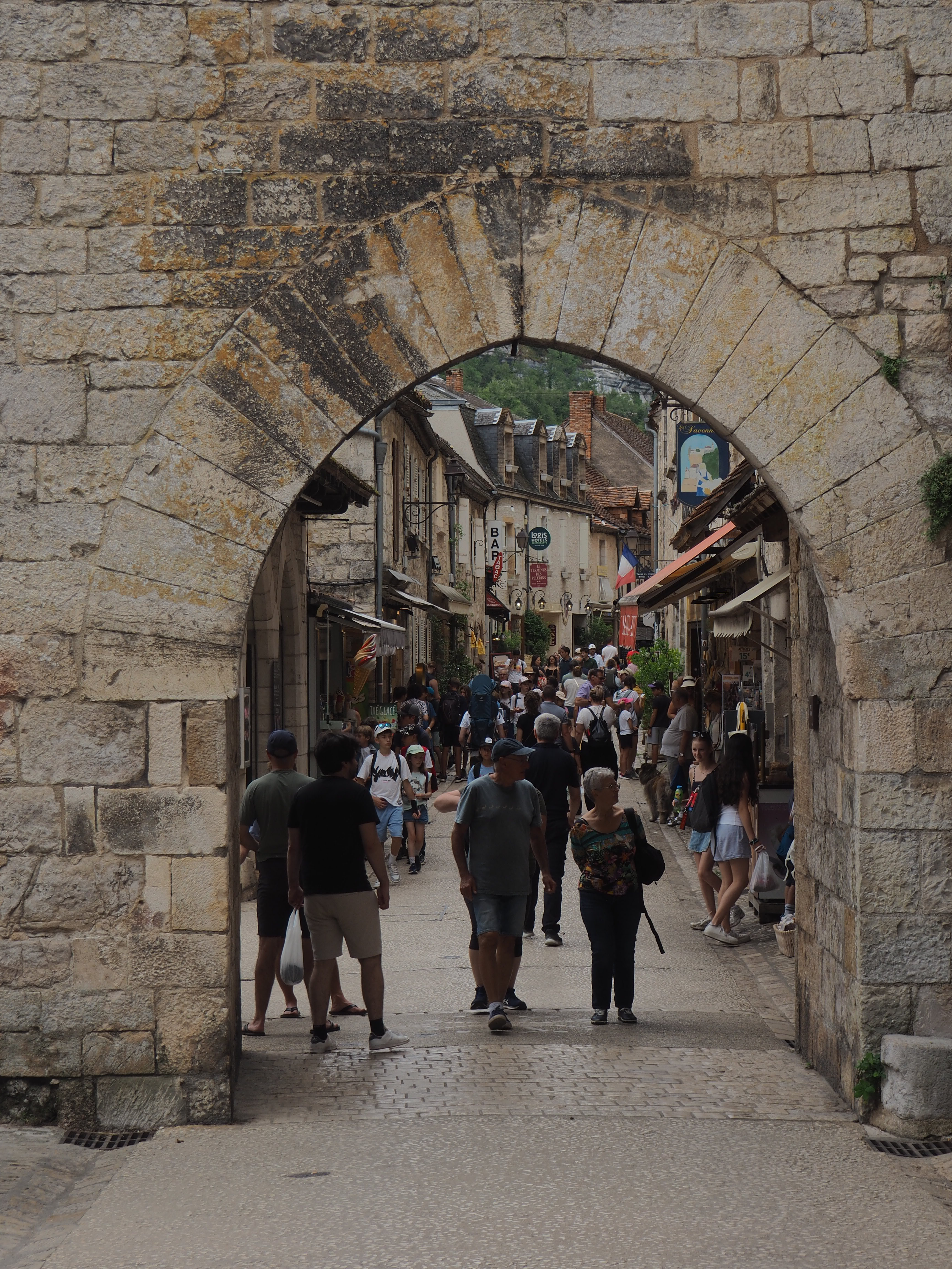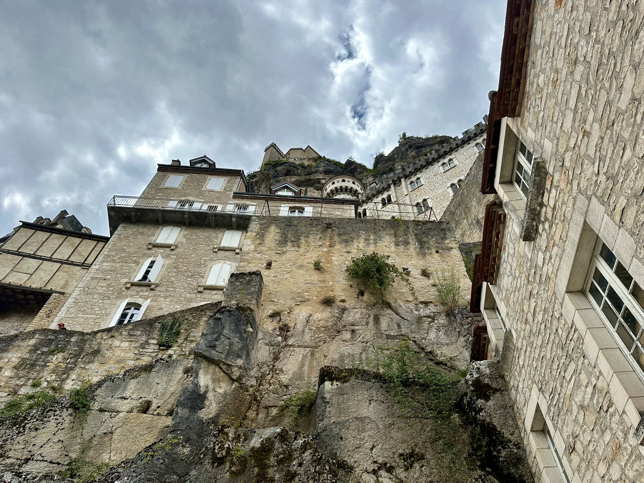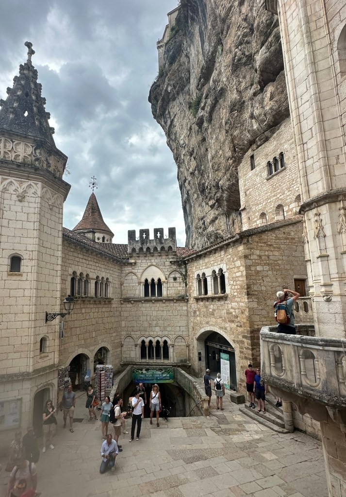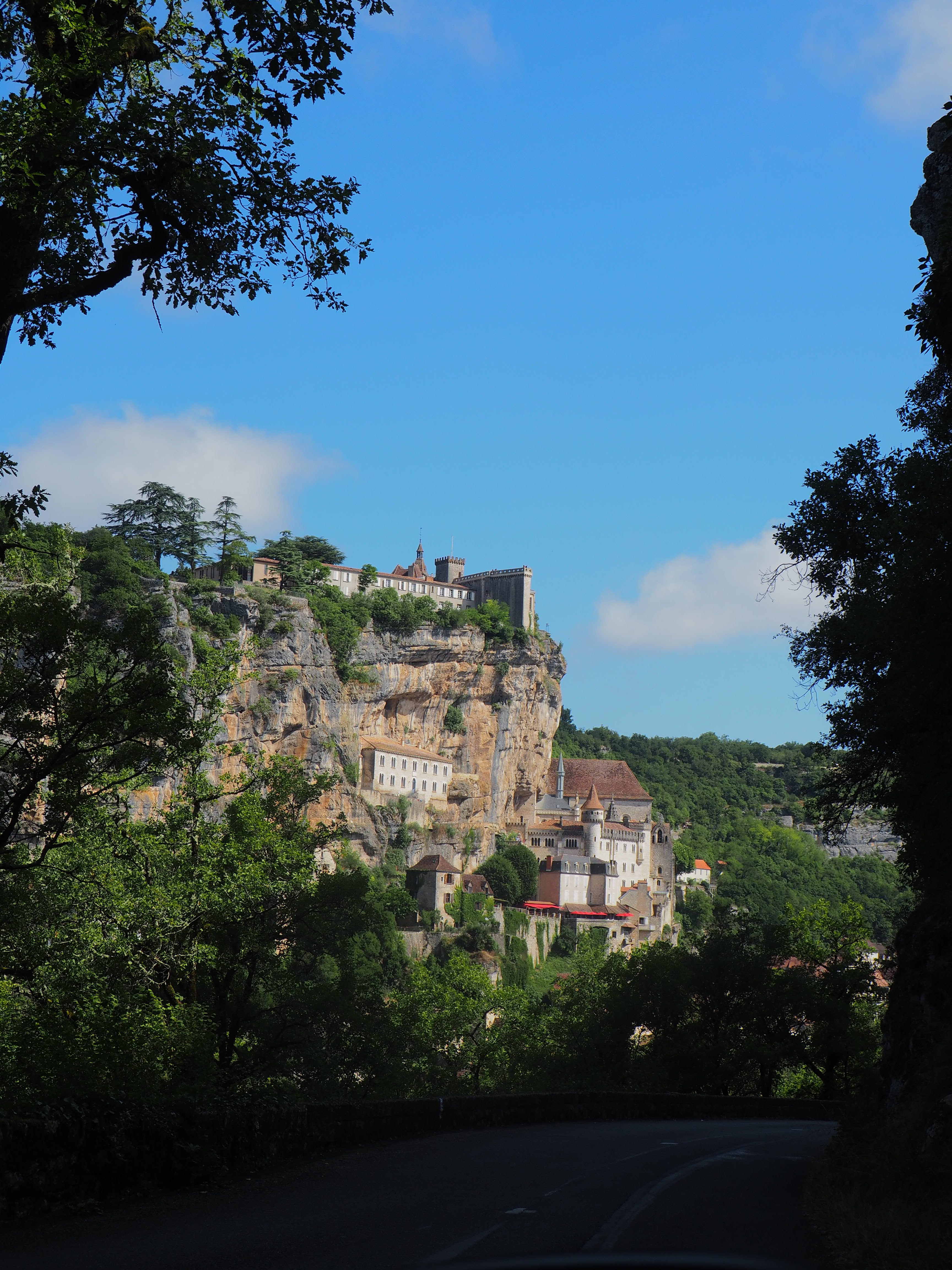 Rocamadour. While visiting our friend, we went off to see Rocamadour. Rocamadour’s clifftop structures embody the three orders of a medieval society: top level castle for the knights, middle level churches for the religious order and lower level for the working class. We drove in from across the Alzou Valley gorge and then wound our way up the narrow twisting streets and tunnels (in which you hope no tour bus is headed the opposite direction) to the P2 parking lot near the castle, which is amply sized.