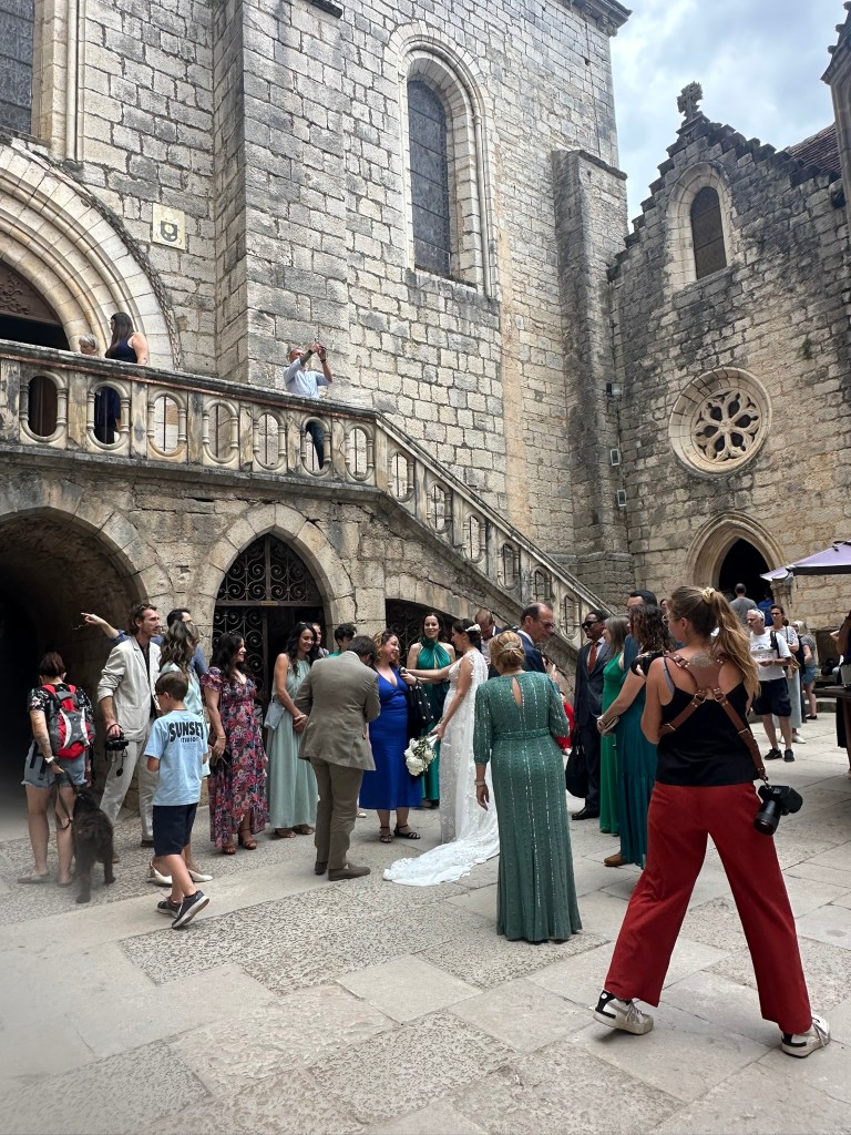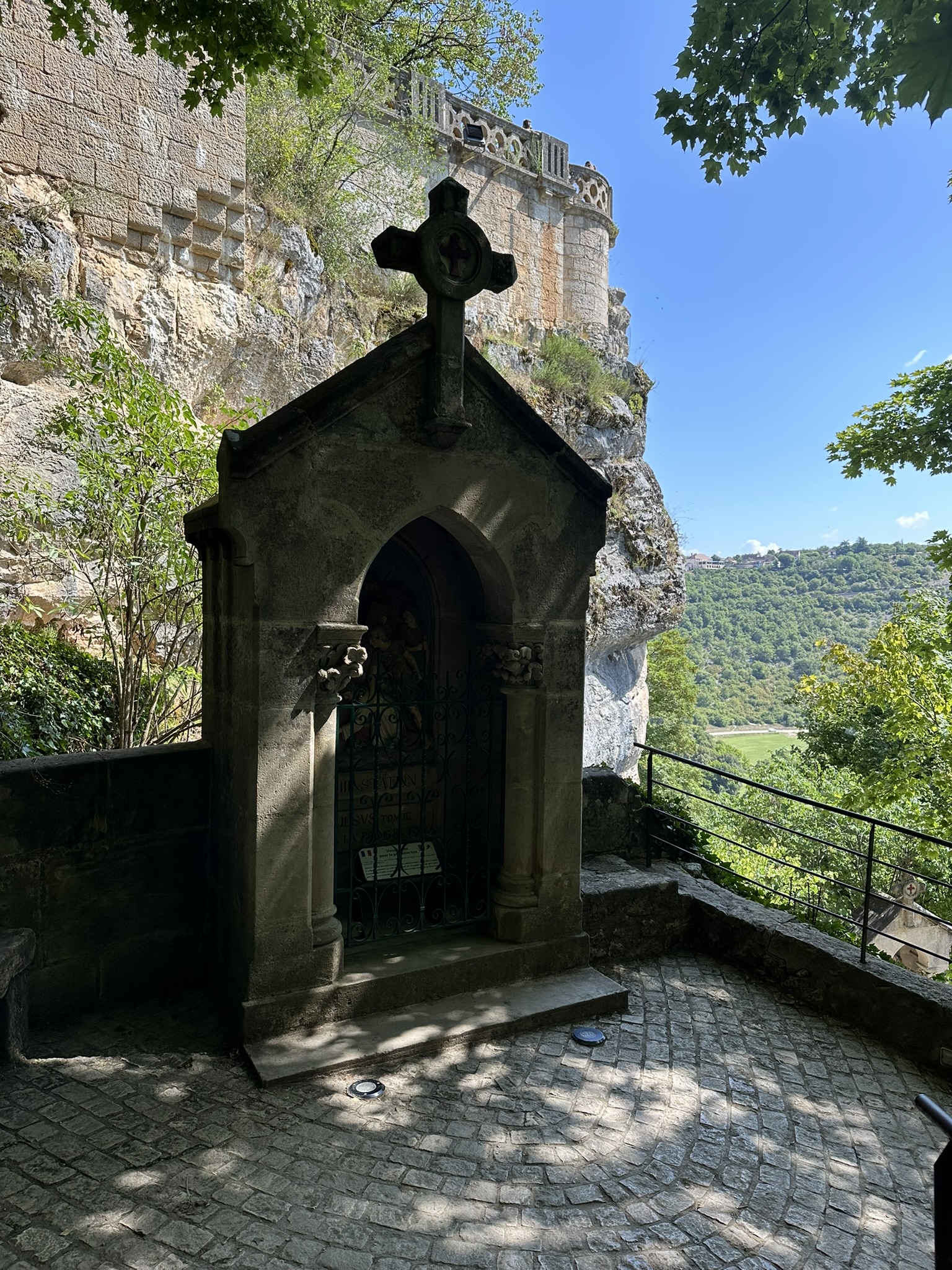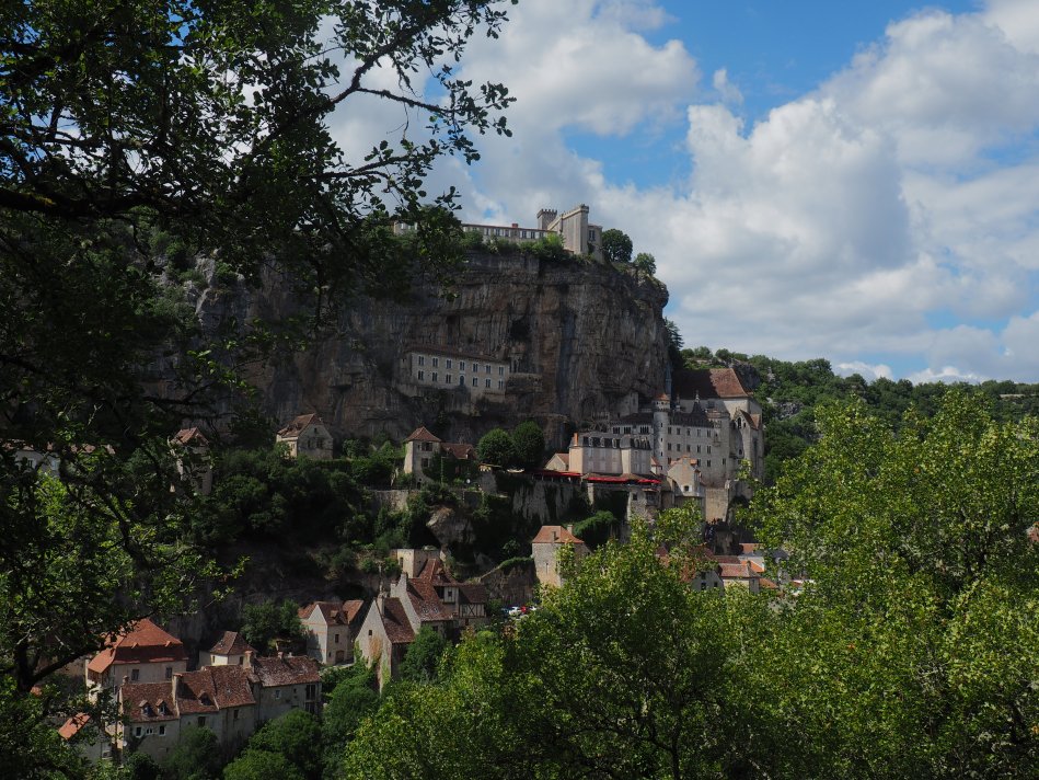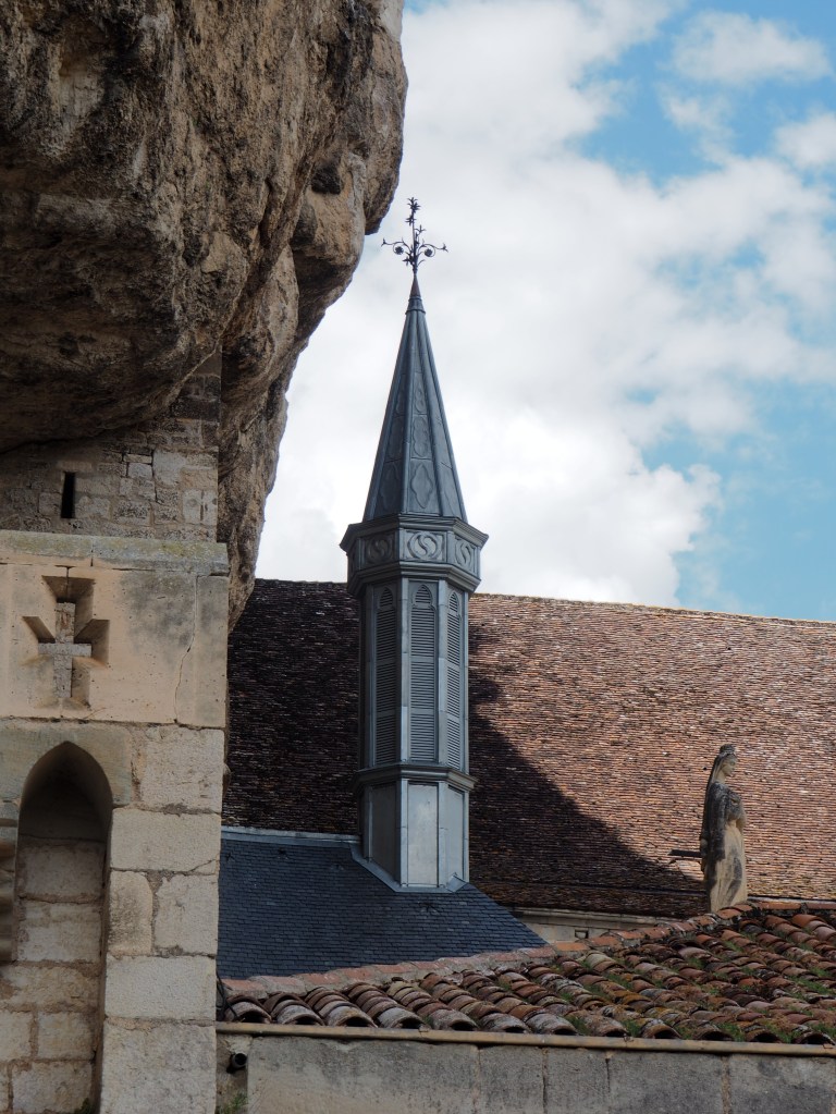 Rocamadour. While visiting our friend, we went off to see Rocamadour. Rocamadour’s clifftop structures embody the three orders of a medieval society: top level castle for the knights, middle level churches for the religious order and lower level for the working class. We drove in from across the Alzou Valley gorge and then wound our way up the narrow twisting streets and tunnels (in which you hope no tour bus is headed the opposite direction) to the P2 parking lot near the castle, which is amply sized.