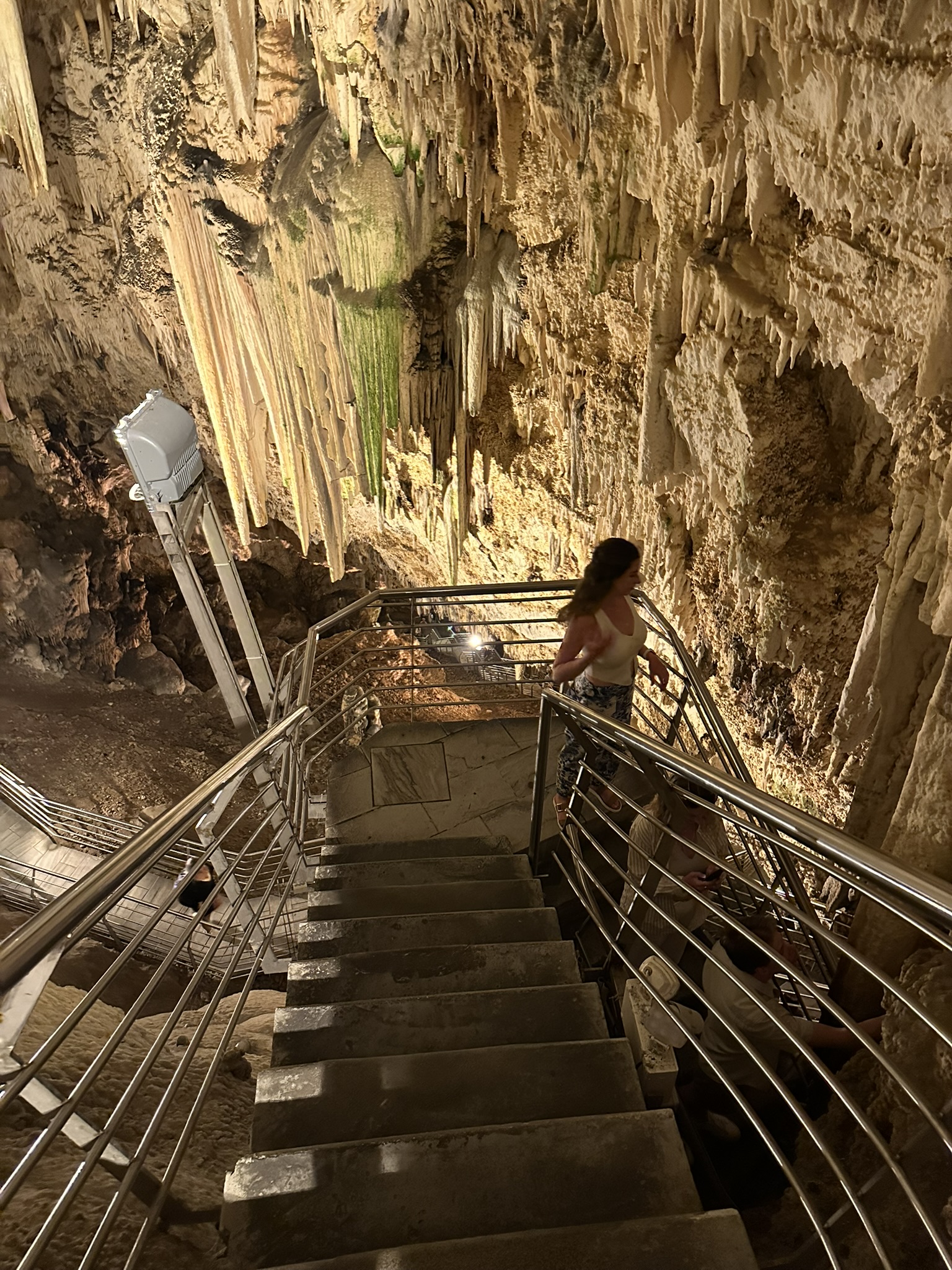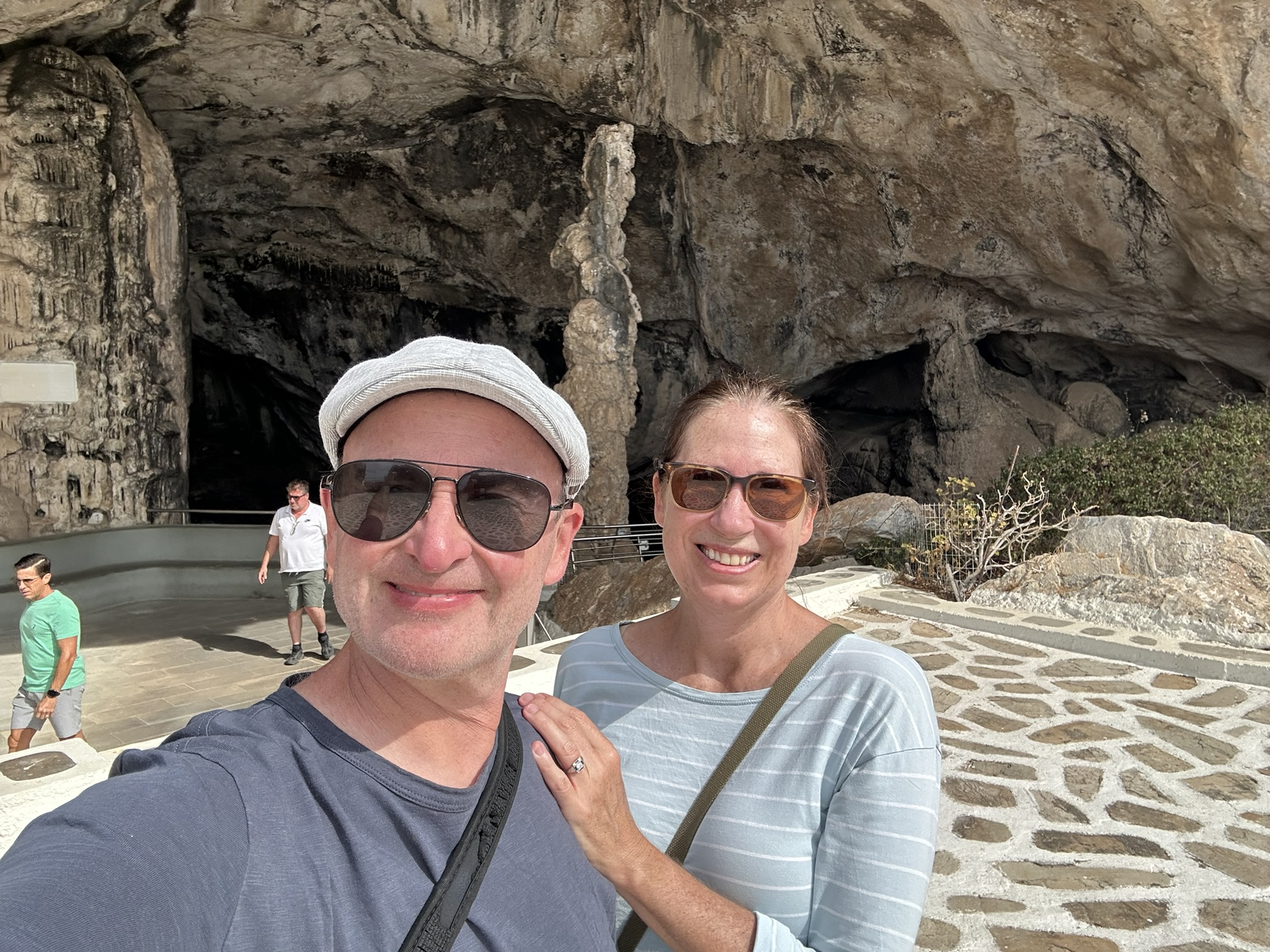On Antiparos, we beelined for the Cave of Antiparos a 280 foot deep cavern with hosts of beautiful stalagmites and stalactites accessed via a 421 step concrete and metal staircase. The cave has been used since prehistoric times but its most famous visitor in history was the Marquis of Nointel, who was the Ottoman ambassador from France under King Louis the XIV. He was staying on Paros when he heard of a great statue on Antiparos. He made the trek to the cave and found that the statue was actually a massive stalagmite. He was lowered by a rope, lit many candles and held Christmas mass in the cave, staying for three days.