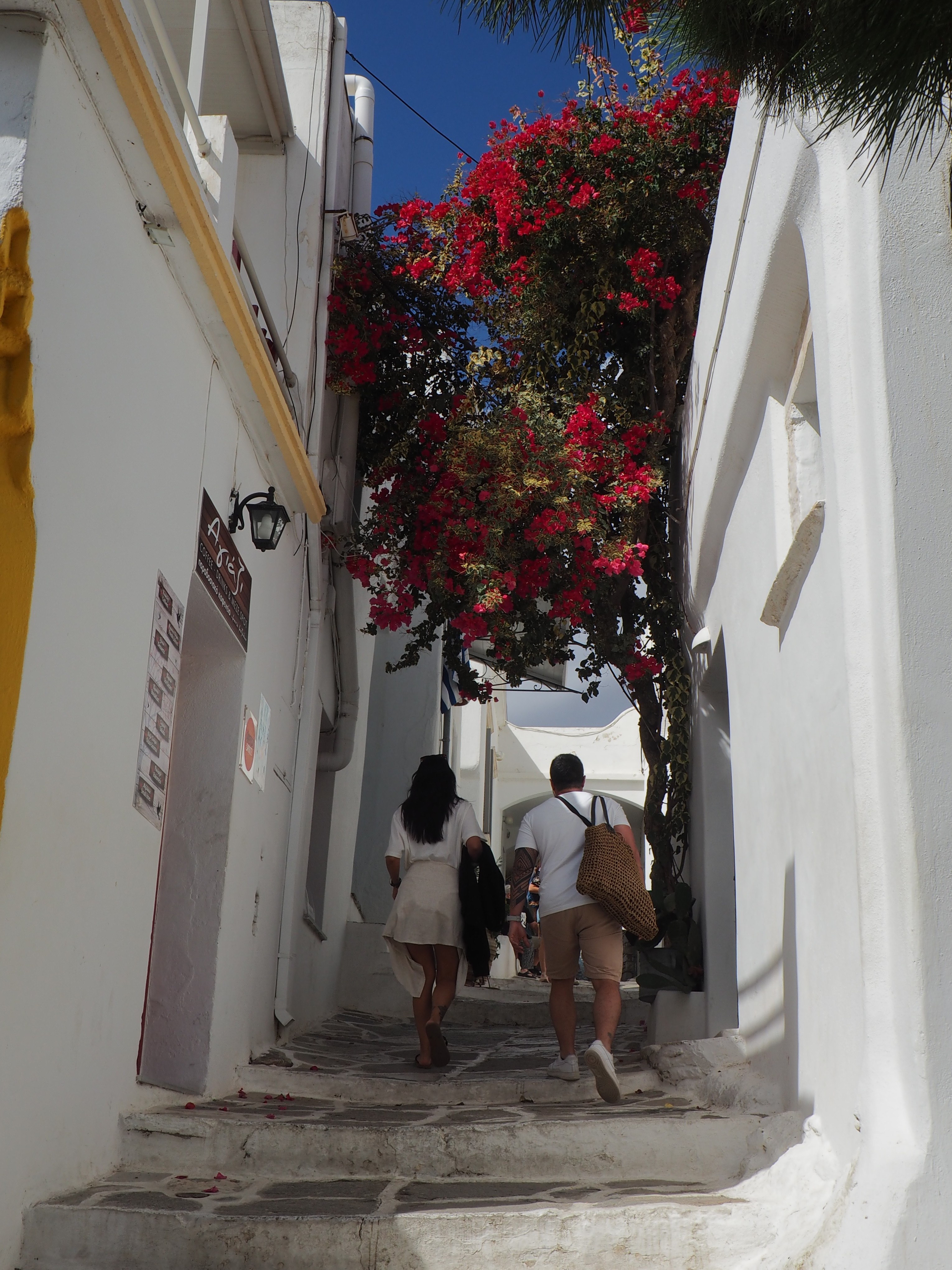 After leaving the cave, we drove along the coastline taking in views of Paros and Naxos, then returned to port for lunch in the back garden at Epestrefe whose salads were great.