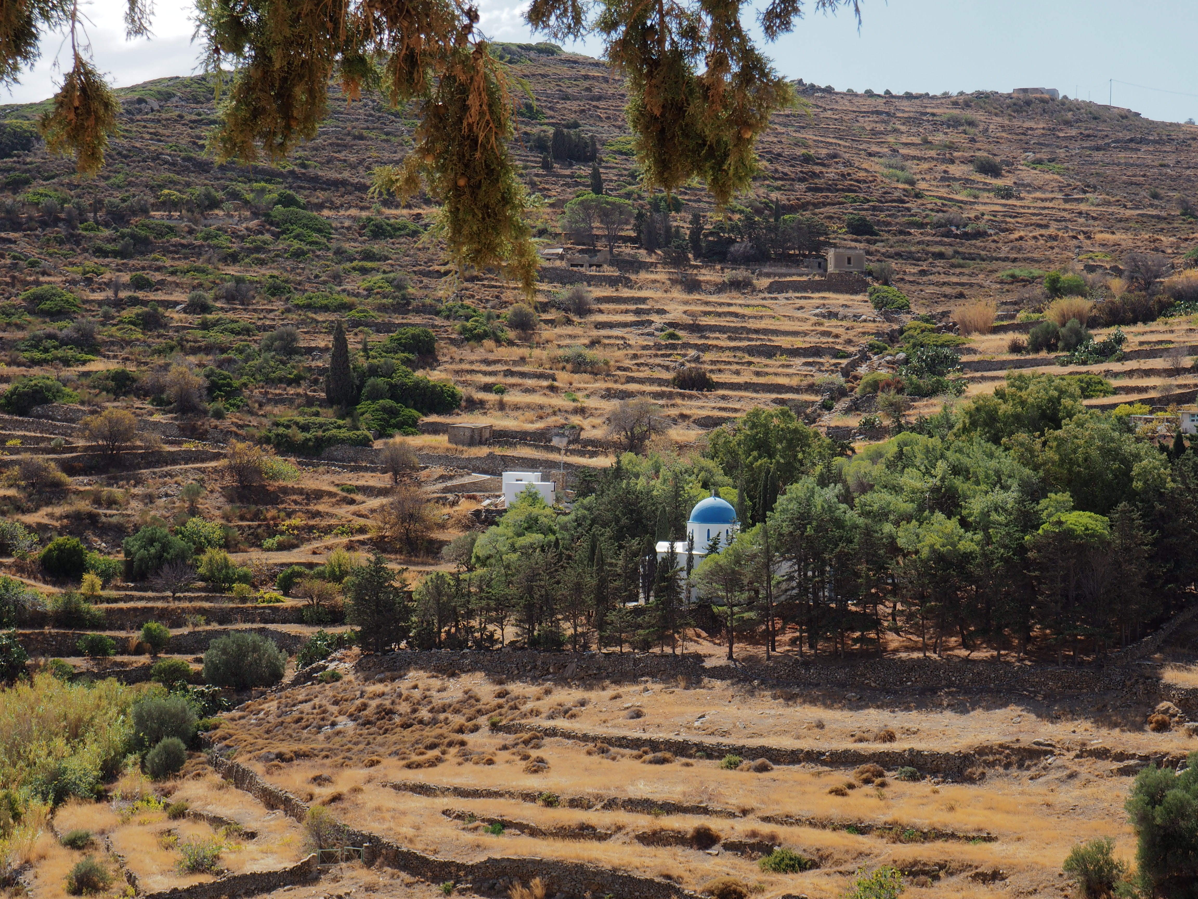 From the beach, we drove up the mountain to Lefkes, a hillside Cycladic village of whitewashed buildings, shops and restaurants where we wandered the maze of streets and admired its distinctive Triada church and the views from it. Lefkes is a starting point for the Byzantine trail you can hike to check out some ancient windmills. Having seen quite a few windmills already, we headed back to Naousa for a delicious lunch in the port at Calypso.