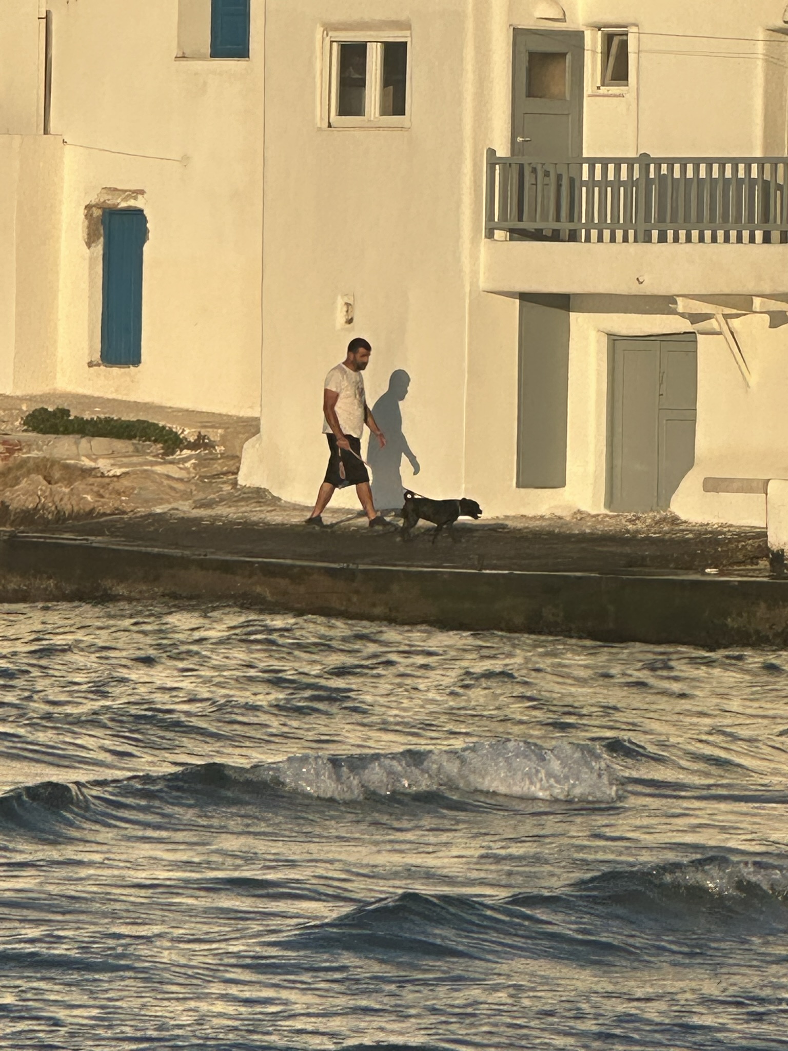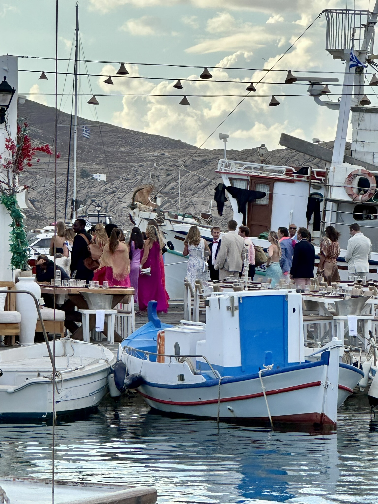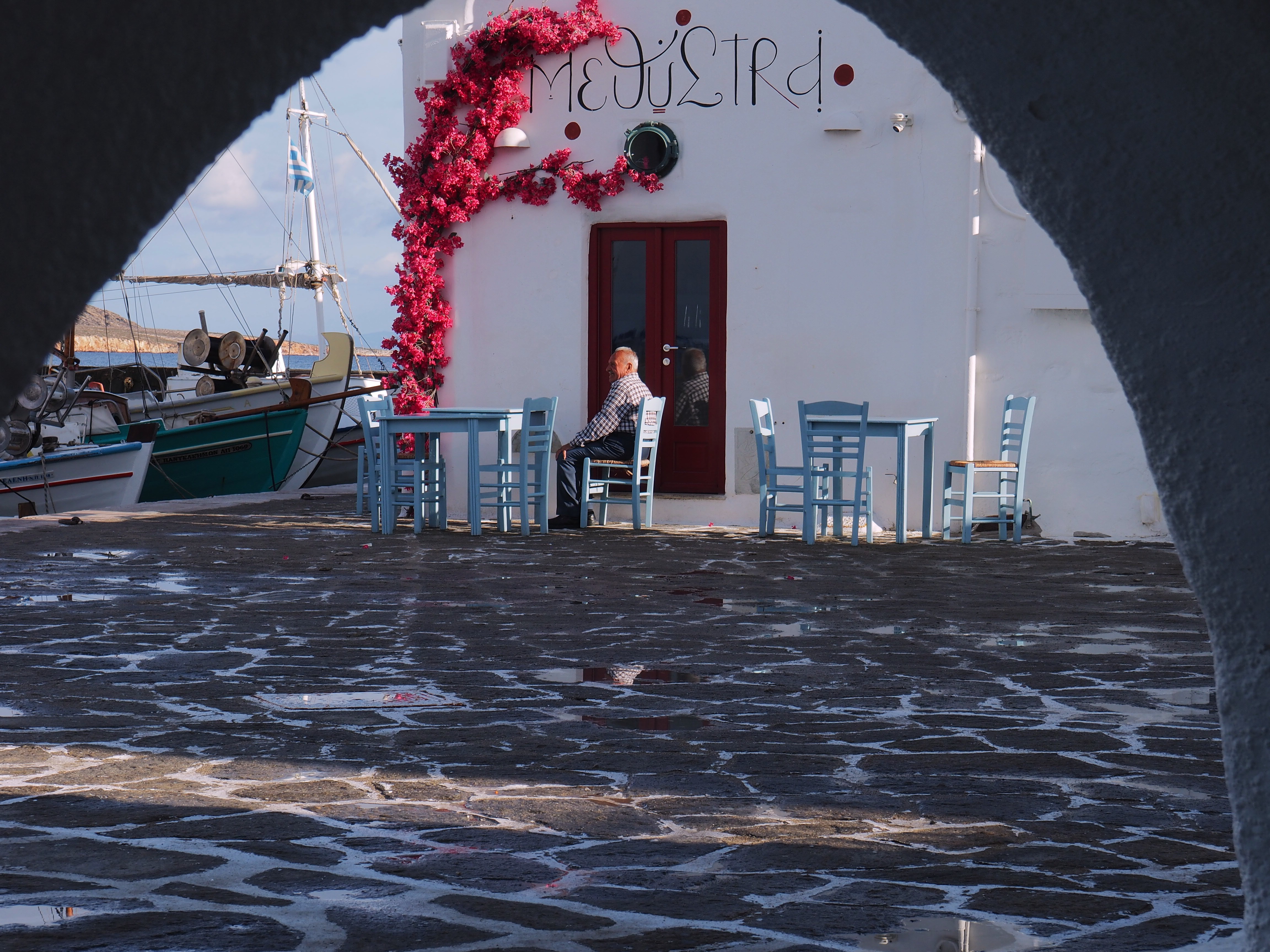 But as if to make up for the rubbish, our last night as we set out for one more meander through town a downpour emerged, and we darted under the portside umbrellas of a local tavern. And as we quaffed our final glasses of island Assyrtiko wine and 56 Isles Pilsner beer a double rainbow presented itself in its full glory as two boats full of colorfully adorned bridal party members set out, in the pouring rain, for a wedding party. A final harmonious tip of the cap to the romance and beauty of these Greek isles.