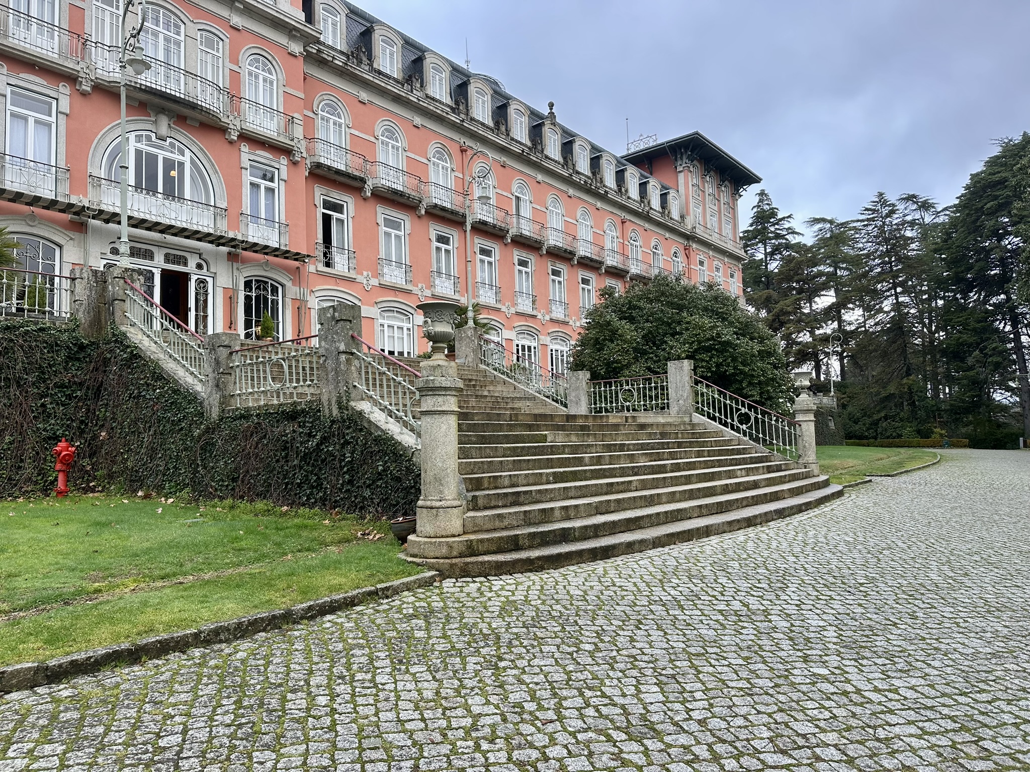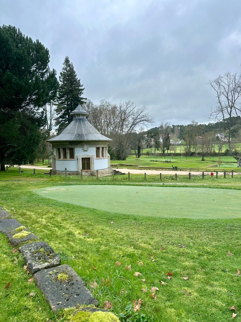 On our tour of northern Portugal nearly five years ago, we stayed at Vidago Palace‘s sister property at Pedras Salgadas Spa and came to Vidago for lunch one day. We were awed by its dramatic pink façade, intrigued by its history, charmed by its food and service and excited about its on-site golf course (well, one of us was anyway). So, we pledged to come back and stay one day.