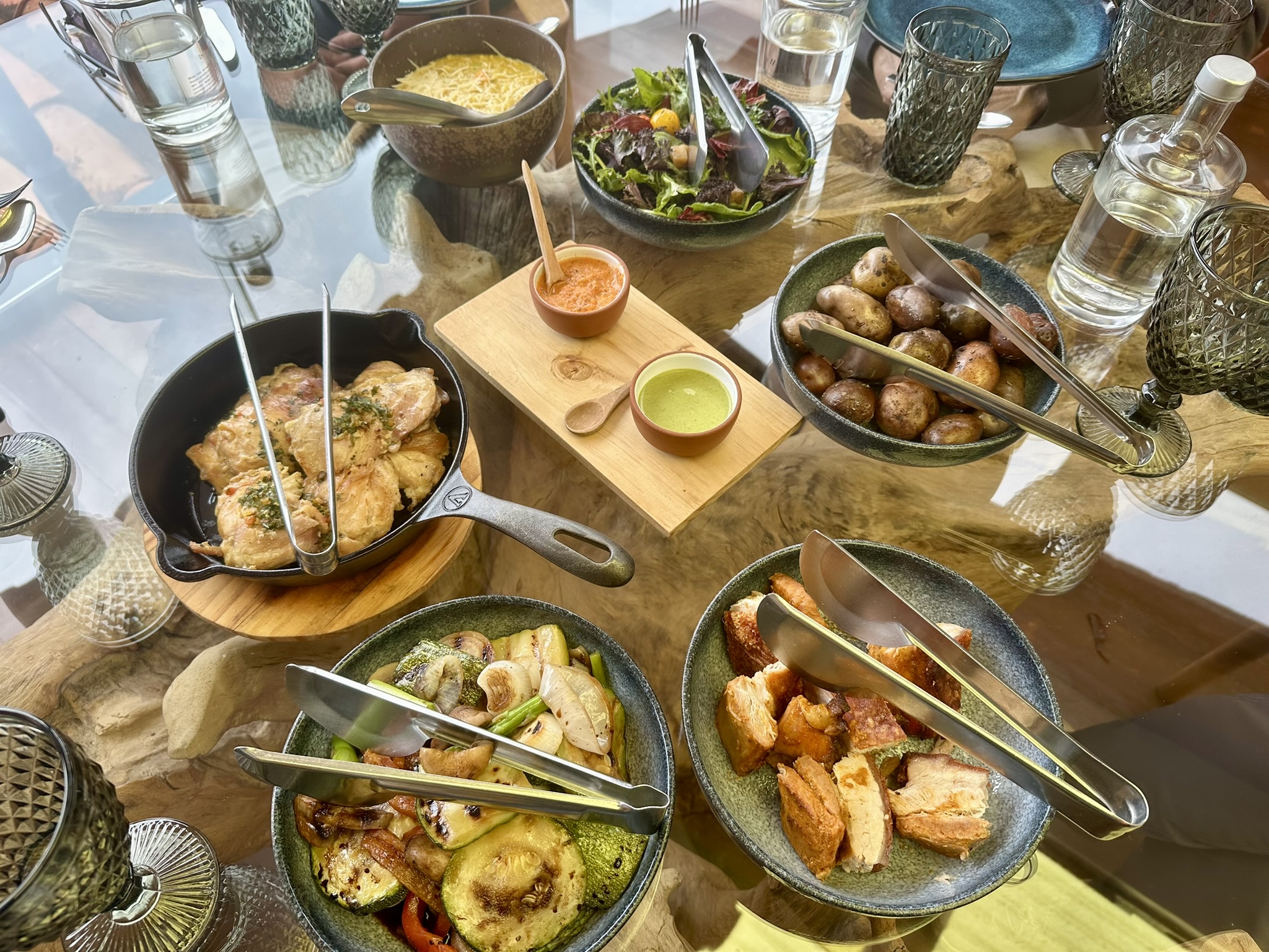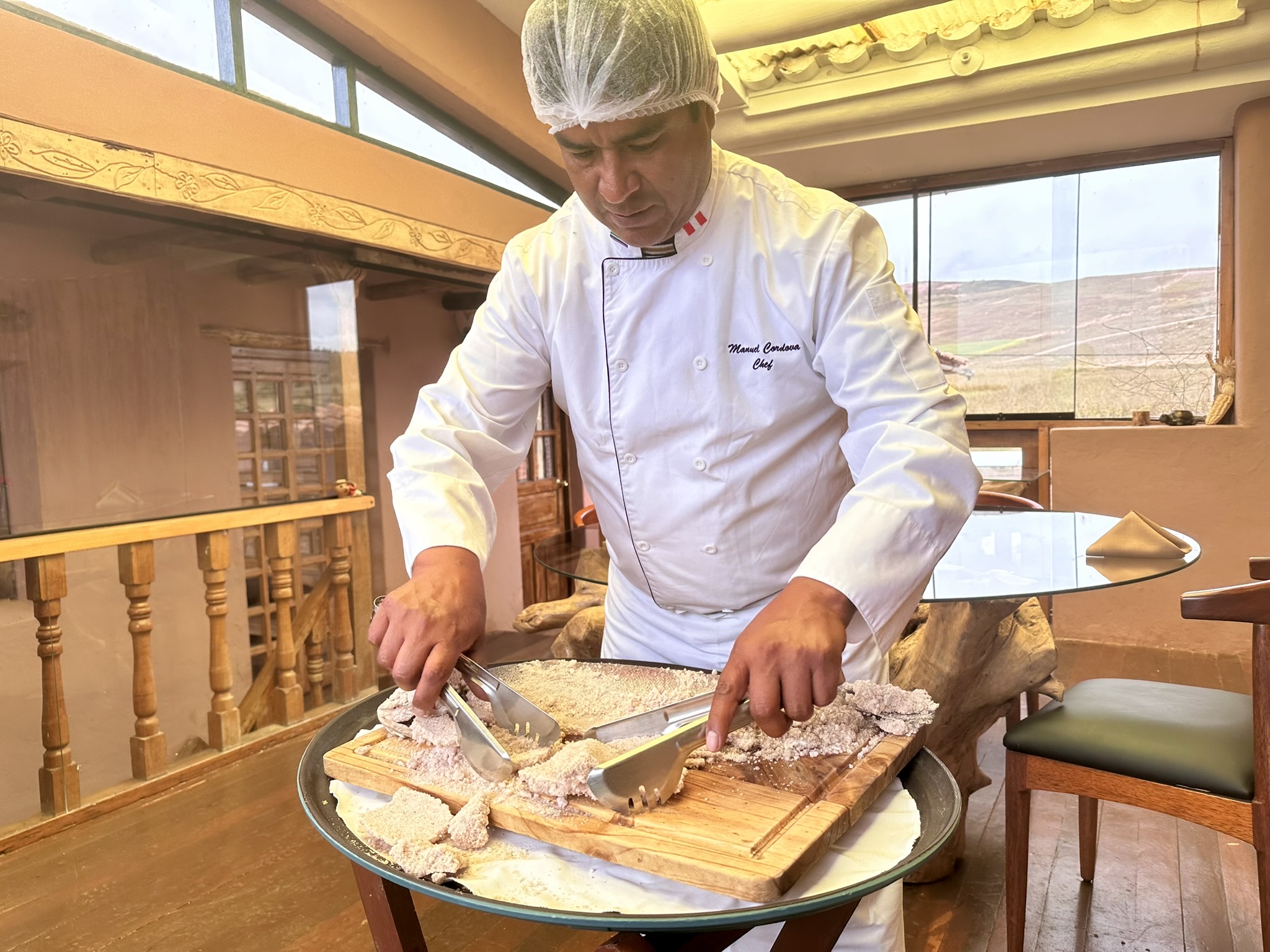 We were greeted with muña mint tea (we are forming an addiction to this stuff, which allegedly helps with altitude) in the yard and assembled with our hosts and guides at a round table overlooking the Tiobamba churchyard with the high Andes beyond. Lunch was ample, more than. We were served grilled vegetables, smoked and salted trout, pork belly, chicken, potatoes and beef capped off with a coconut cheesecake and the most delicious flan ever made. Seriously. Ay caramba, papa’s gonna need a diet when all this is done.