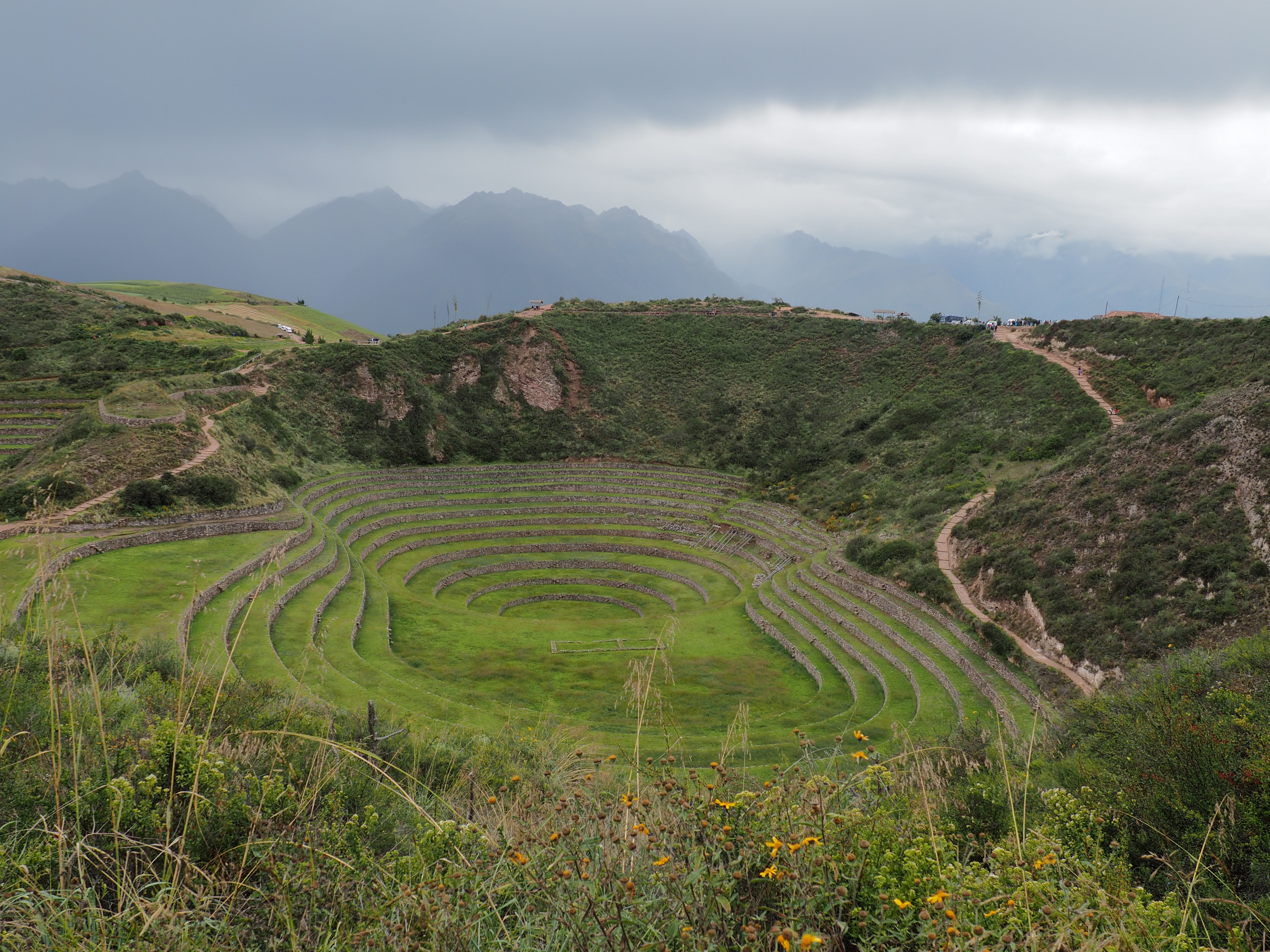 Maray. We began our tour at Maray, a remarkable Inca site. During the Inca days, they used a natural depression in these high plains to carve four semicircular circuits with seven layers each, it is speculated, to improve and adapt seeds for crops at various altitudes. Present day scientists have measured the soils and found that the bottom of these circles have soil like that of the valley floor below with each semicircle representing soils of increasing altitude.